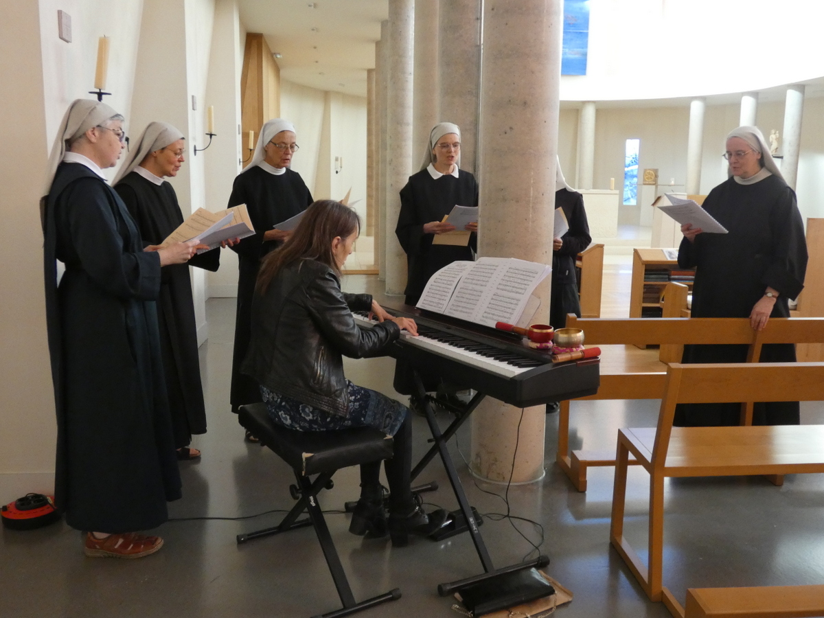‘’Chanter c’est prier deux fois’’ c’est ce que nous avons expérimenté avec cette première halte chantante. Une dizaine de participants ont répondu à cette proposition qui leur a permis de découvrir la vie monastique autrement. Sous la direction de Carole Matras, amie de nos monastères depuis notre quatrième centenaire, épaulée par des sœurs de Prailles, Jérusalem et Bouzy-la- Forêt, la proposition offrait différents répertoires, chants en français, grégorien, compositions médiévales et quelques pièces du répertoire de notre Congrégation. Chaque matin, un temps biblique faisait le lien entre les chants travaillés et la Parole de Dieu qui les inspire. Les Vigiles du samedi soir et la messe du dimanche étaient animés par cette schola bigarrée. Une belle ambiance qui s’est retrouvée lors de l’aubade donnée après la messe, la joie était dans les cœurs lors du déjeuner dehors tous ensemble qui a clôturé cette belle semaine. Tous ont apprécié l’implication de Carole et des sœurs, chanter ensemble uni les voix et les coeurs !
